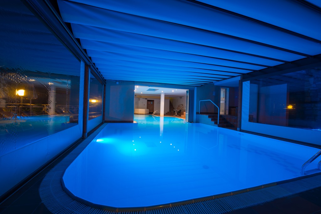 L'Hotel Eden del Garda *** dispone di una piscina confortevole che si trasforma in due piscine ad utilizzo esclusivo dei suoi ospiti. All’ Hotel Eden troverete una piscina coperta, riscaldata costantemente alla temperatura di circa 27°. La sua particolarità è quella di poter essere chiusa e perciò adatta anche nelle giornate più fredde o può avere la copertura aperta e trasmormarsi in una piscina esterna racchiusa nel giardino dell'Hotel con vista sul Lago di Garda. La piscina semiolimpionica, delle misure di 18x10 m e per una profondità di 1,41 m, è pensata per permettere di nuotare in tutta libertà, ma consente anche di giocare garantendo ai genitori un relax privo di preoccupazioni. La nostra zona piscina si trova in un luogo tranquillo a soli pochi metri dalle camere, da cui potrete vedere i nostri ulivi e la natura. L'utilizzo continuo della piscina aiuta in moltissimi casi, determina un’esfoliazione naturale della pelle, stimola tramte la diuresi alla eliminazione delle tossine, aiuta l’apparato cardio-circolatorio riducendo la pressione arteriosa, inoltre anche a seguito di esiti post-traumatici può dare benefici all’apparato locomotore (lombare, cervicale ecc.). La nostra piscina viene baciate dal sole sino al tramonto, ed è contornata da un'area solarium attrezzata con lettini ombrelloni, sdraio, e durante il periodo estivo anche con servizio bar, per permettevi di mangiare anche un gelato mentre vi state rilassando sotto il sole gardesano, o anche per solo un caffè o qualche bibita. Alla sera la nostra piscina è delicatamente illuminata con una luce blu, in modo da creare un' atmosfera ed una cornice molto suggestiva per i nostri clienti che intendano rinfrescarsi nella terrazza dell'hotel provando la brezza proveniente dal Lago di Garda, che rinfrescherà le calde sere estive.